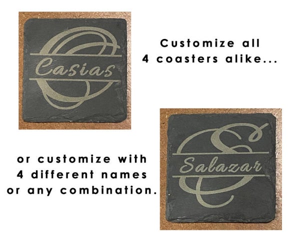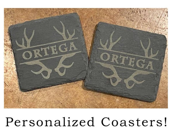 Personalize your slate coasters with your name, location, favorite sports team, or other design. Each set come with 4 coasters.
