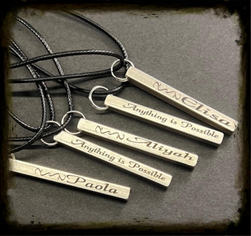 Choose the bar color, connector from bar to necklace, and necklace color. You can also choose a custom wooden box with a personalized message.